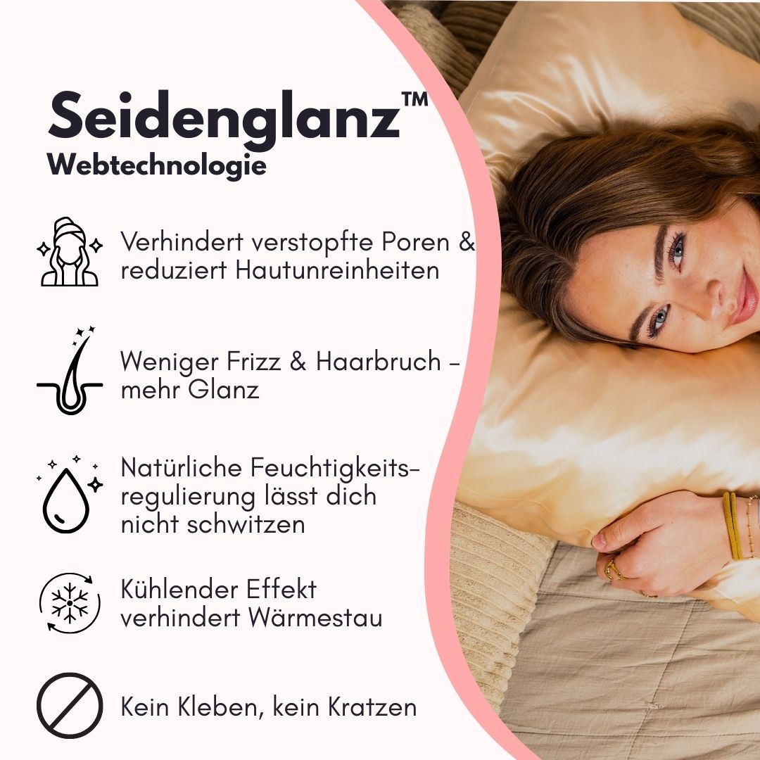 Seide gleitet sanft – mit deutlich weniger Reibung als Baumwolle. Das reduziert Haarbruch, Spliss und Frizz deutlich und schützt deine Längen über Nacht.